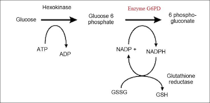 Thiếu enzyme Glucose-6-phosphate Dehydrogenaze (men G6PD) là nguyên nhân chính gây bệnh thiếu men G6PD. Enzyme này được tìm thấy trong tất cả các tế bào của cơ thể và được sử dụng trong quá trình chuyển hóa đường. Cụ thể enzyme G6PD xúc tác cho phản ứng oxy hóa glucose-6-phosphate thành 6 phosphogluconate đồng thời khử NADP+ thành NADPH – yếu tố cần thiết trong quá trình sinh tổng hợp glutathione. Glutathione là chất chống oxy hóa có chức năng bảo vệ màng tế bào khỏi các tác nhân oxy hóa. Do hồng cầu không thể tạo ra NADPH bằng những con đường khác nên dễ bị tổn thương, vỡ tế bào dưới tác động bởi các tác nhân oxy hóa hơn các loại tế bào khác trong cơ thể khi bị thiếu men G6PD, gây ra các mức độ khác nhau của thiếu máu tán huyết.