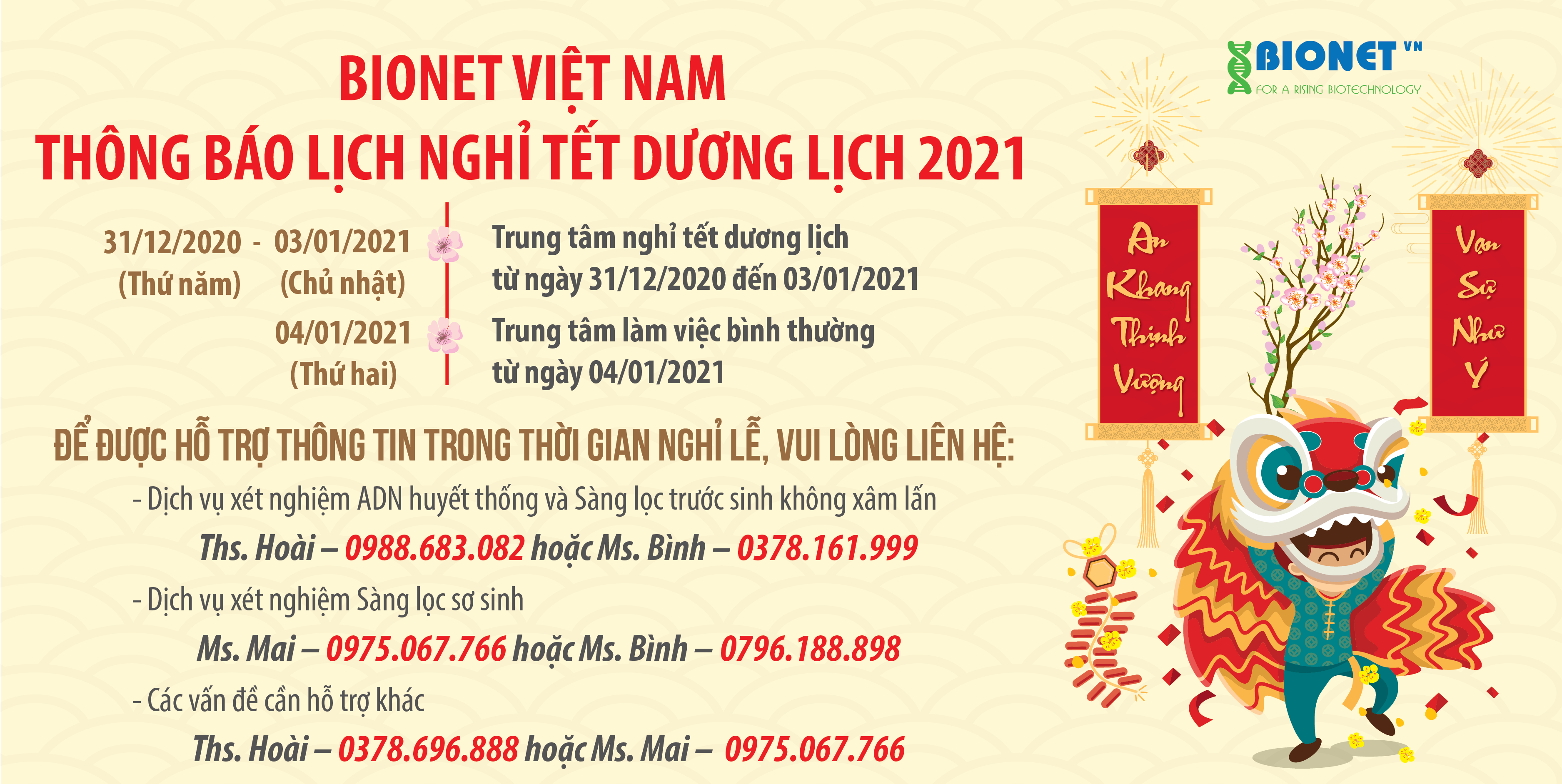 BIONET: THÔNG BÁO LỊCH NGHỈ TẾT DƯƠNG LỊCH 2021