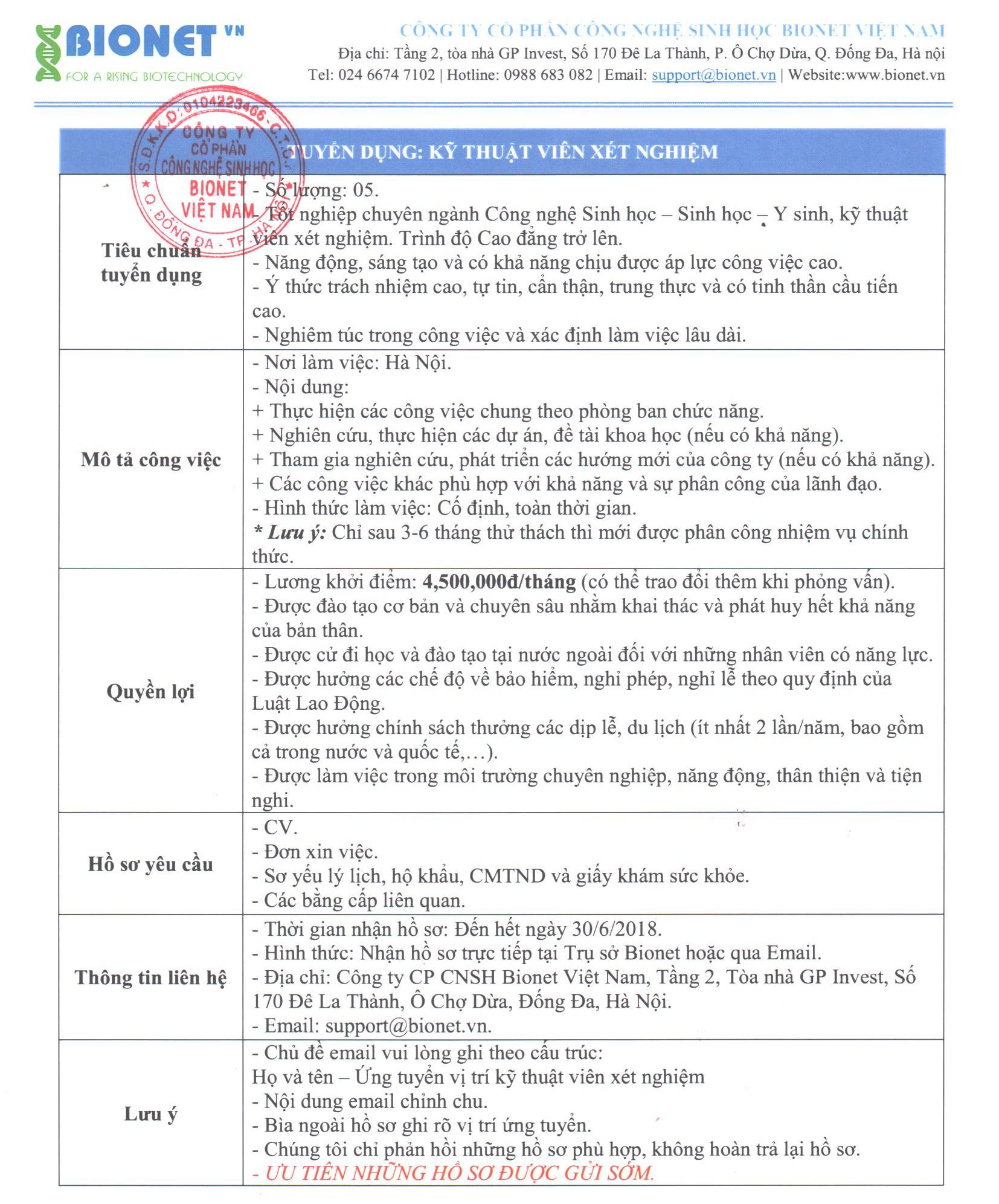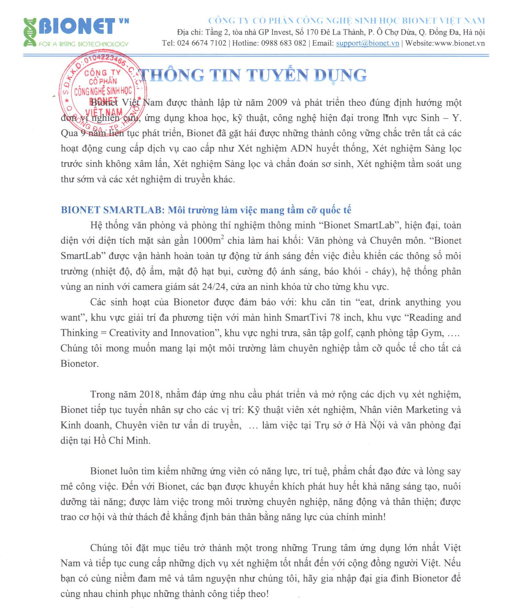 Năm 2018, nhằm đáp ứng nhu cầu phát triển và mở rộng thị trường các dịch vụ xét nghiệm, Bionet tiếp tục tuyển nhân sự cho các vị trí: Kỹ thuật viên xét nghiệm, Nhân viên Marketing và kinh doanh, Chuyên viên tư vấn, … làm việc tại trụ sở Hà Nội và VP Hồ Chí Minh.
