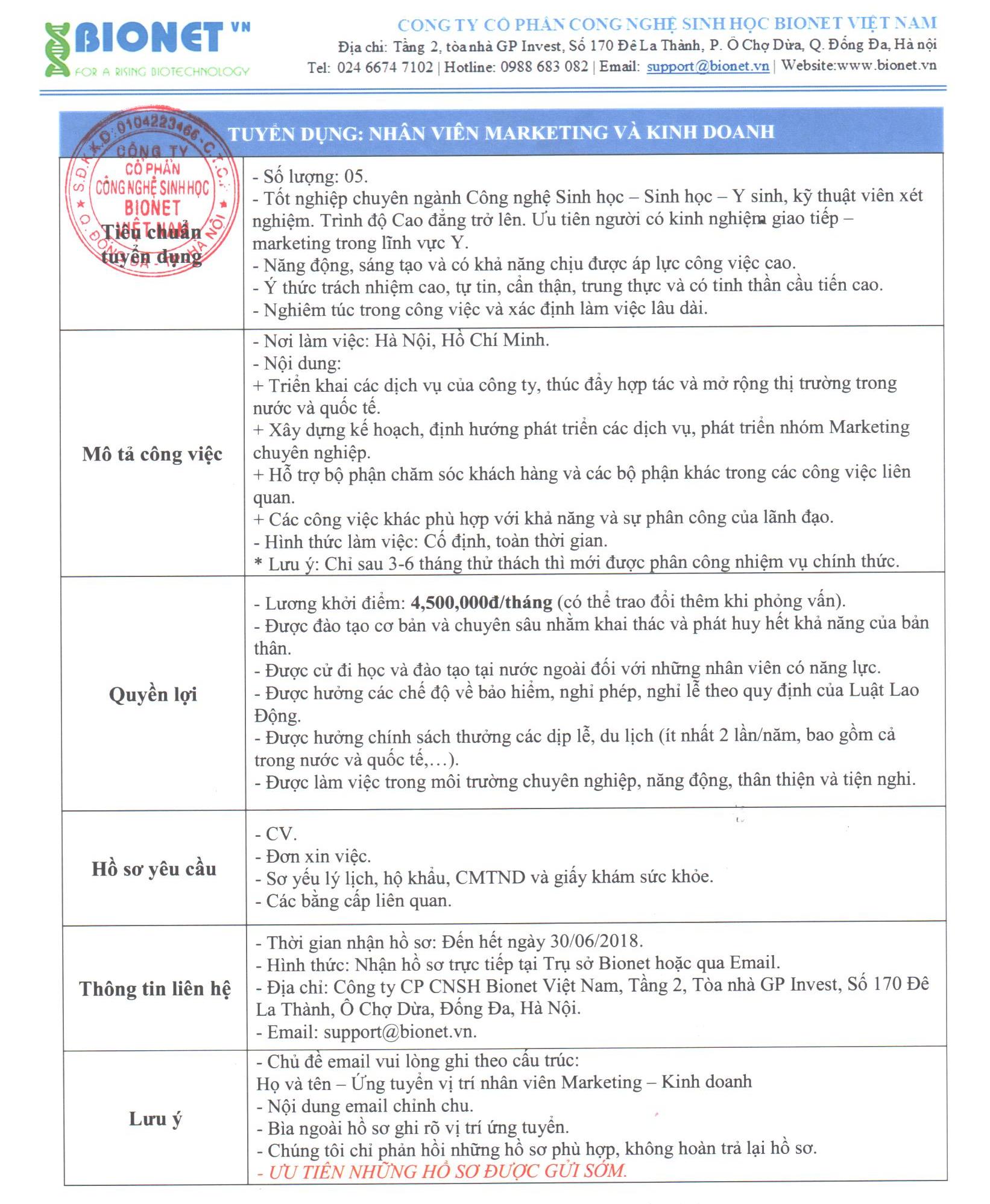 BIONET TUYỂN DỤNG NHÂN SỰ 2018