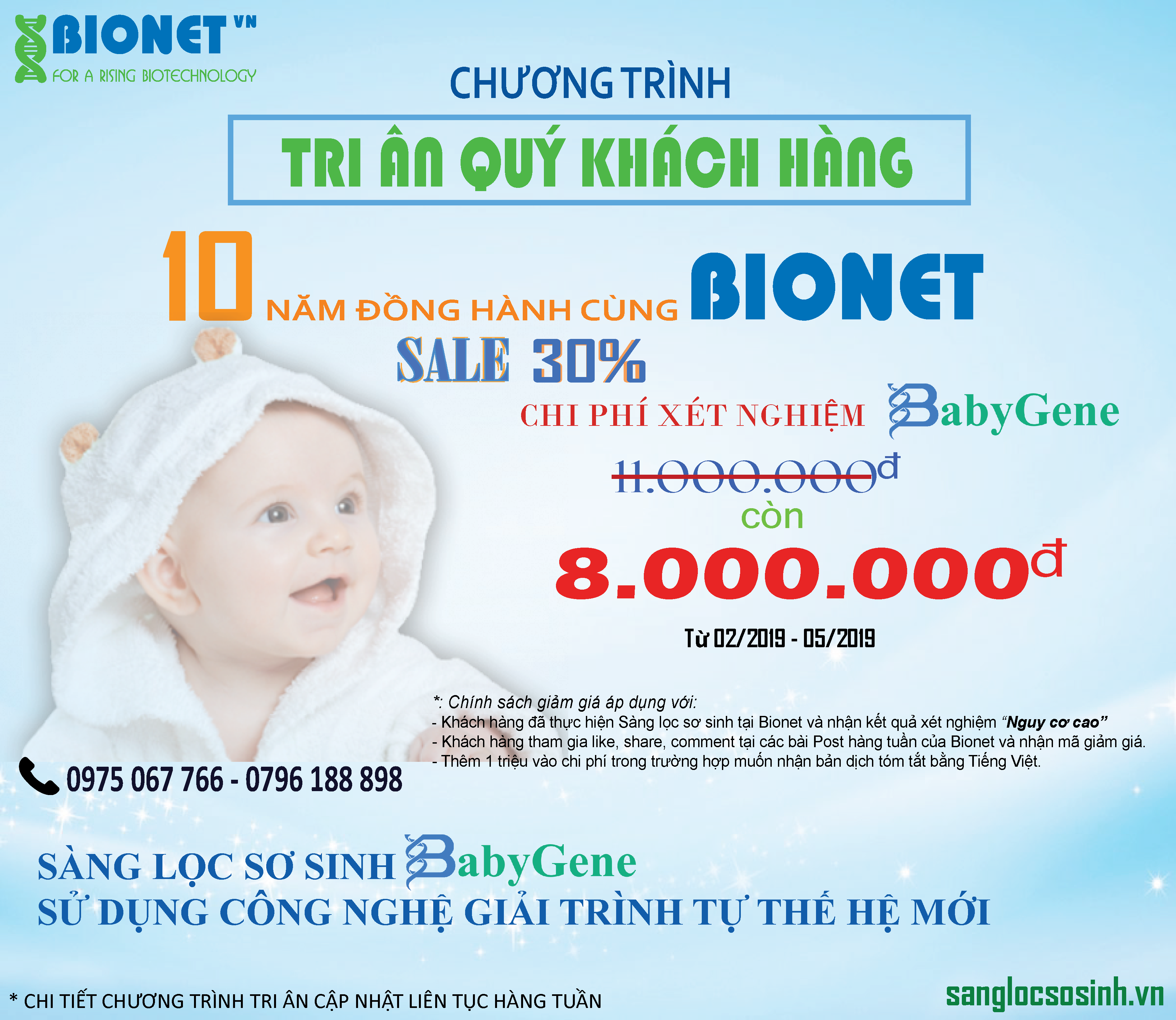 16:16:3619/02/2019Năm 2019 là cột mốc đánh dấu 10 năm hành trình nỗ lực phát triển và đạt được nhiều thành tựu vững chắc trên nhiều lĩnh vực của Bionet Việt Nam. Đặc biệt, trong lĩnh vực Sàng lọc sơ sinh, Bionet đã nhận được sự tin tưởng và hợp tác chặt chẽ từ Quý đối tác ( Sở y tế, Chi cục dân số, Bệnh viện, TTYT, Y - Bác sỹ ) và Quý khách hàng trong và ngoài nước. Thay lời tri ân sâu sắc, Bionet Việt Nam xin gửi tới Quý Khách chương trình tri ân: